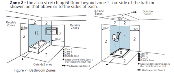 If fitting in a bathroom, TapBoost can be installed in Zone 2 (see diagram) or ideally outside of the bathroom. The electrical power supply unit and mains plug must be protected against moisture and water and the plug must be located outside of the bathroom.