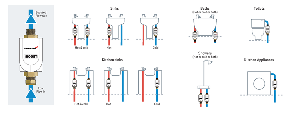 When more than one outlet suffers with poor water performance in a gravity-fed system then a bathroom or whole house pump should be installed – click here to view our full GravityBooster range.